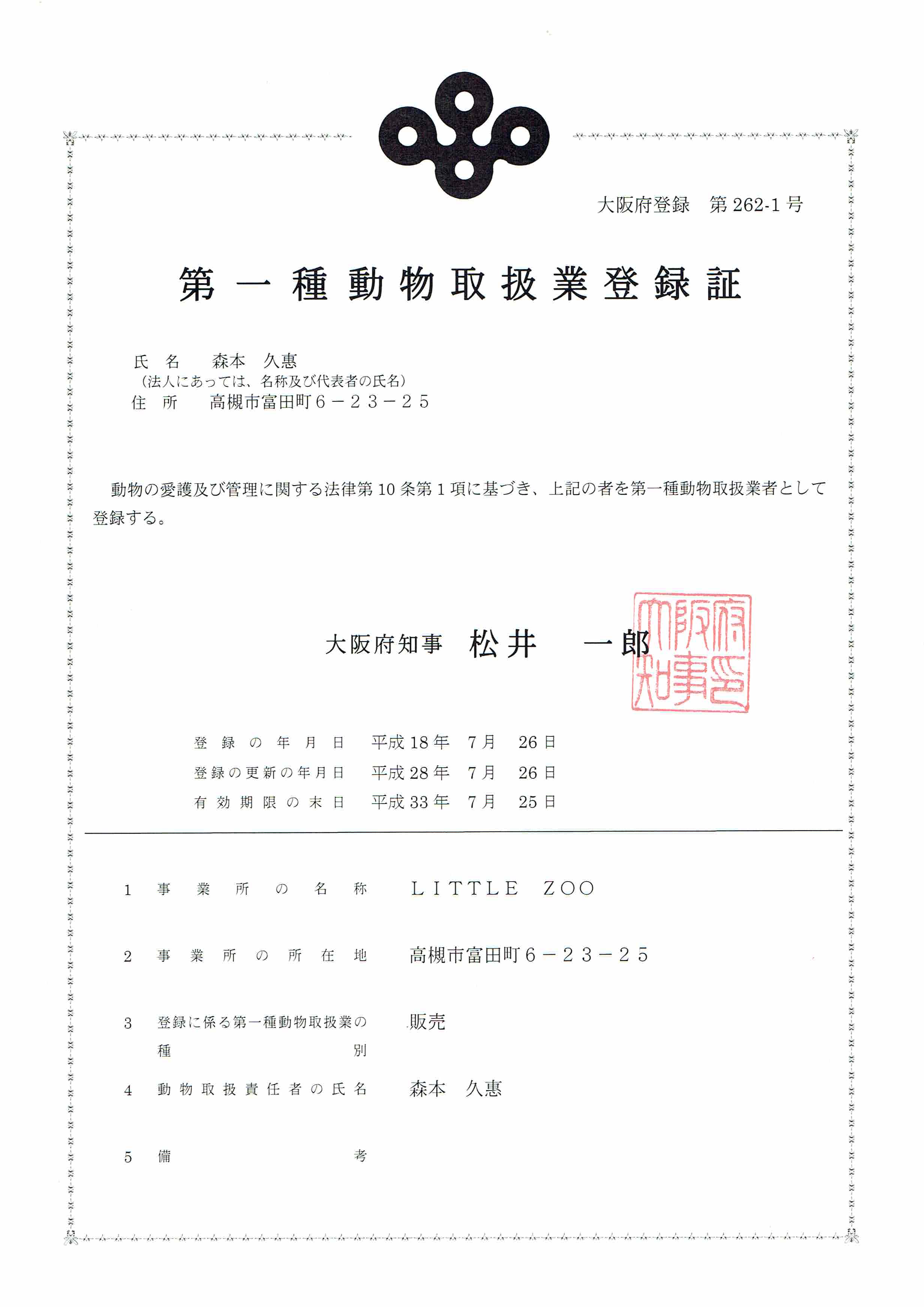 | 大阪府登録 | 大阪262-1 (大阪府動物取扱業登録証は こちら) |